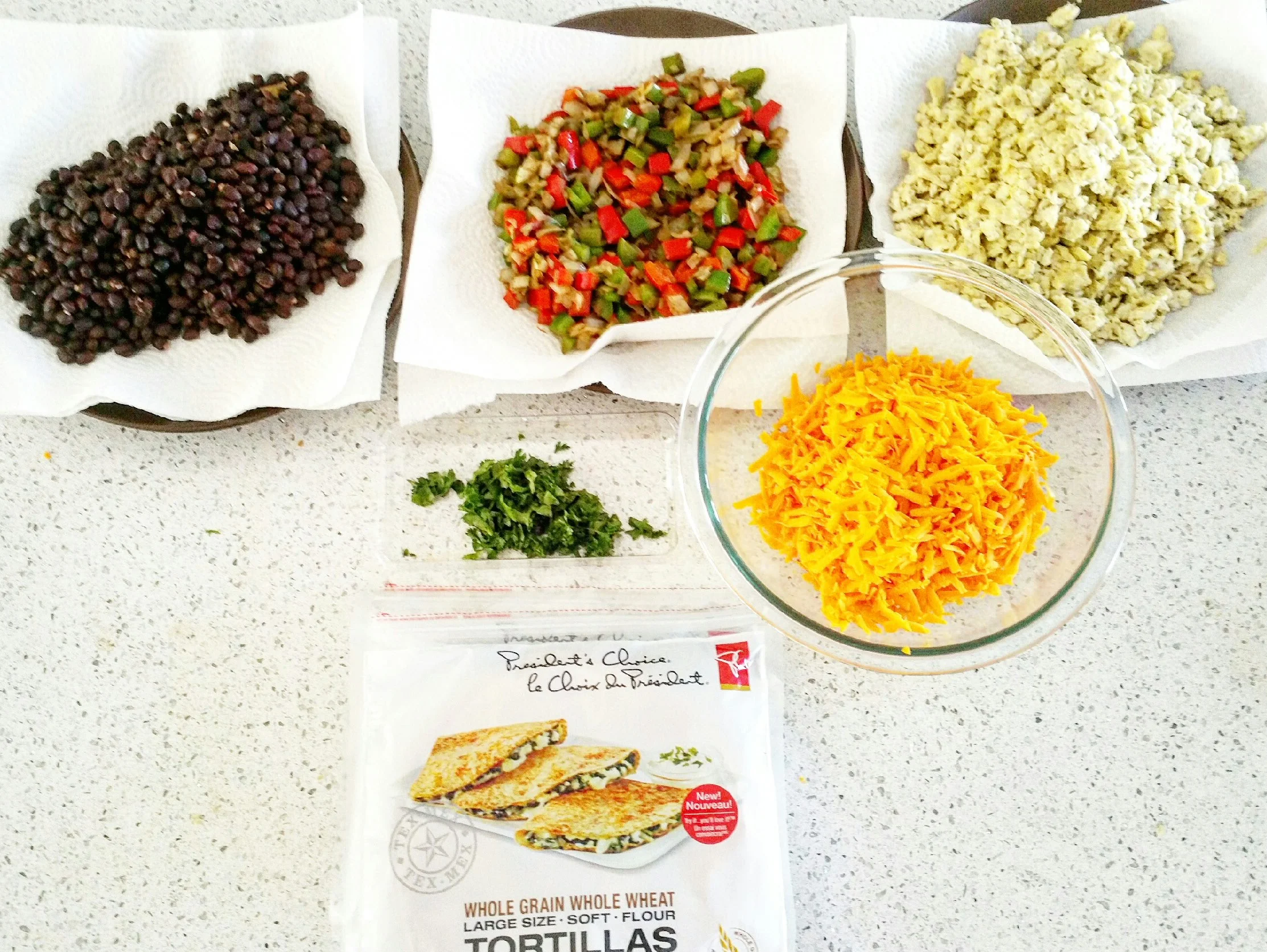 - 2 1/2 C cooked black beans (I fried mine with a bit of lime juice, cumin, S&P and chilli powder)